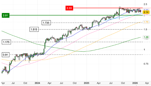 Support around key moving averages suggests the broader uptrend remains intact despite modest year to date weakness. We regard this consolidation as constructive.