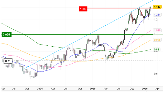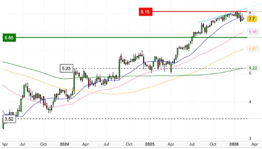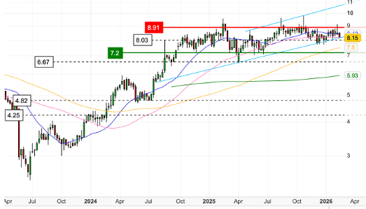The stock recently traded in the $8.30 to $8.50 range after easing from January highs of $9.16 and remains above its 200-day moving average with momentum indicators suggesting scope for further upside before reaching stretched territory.