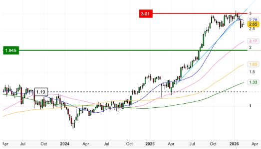 Technically, the stock has delivered substantial long-term outperformance relative to the ASX 200, before consolidating from recent highs. We see the current pullback as constructive rather than concerning, with key support levels now being tested.